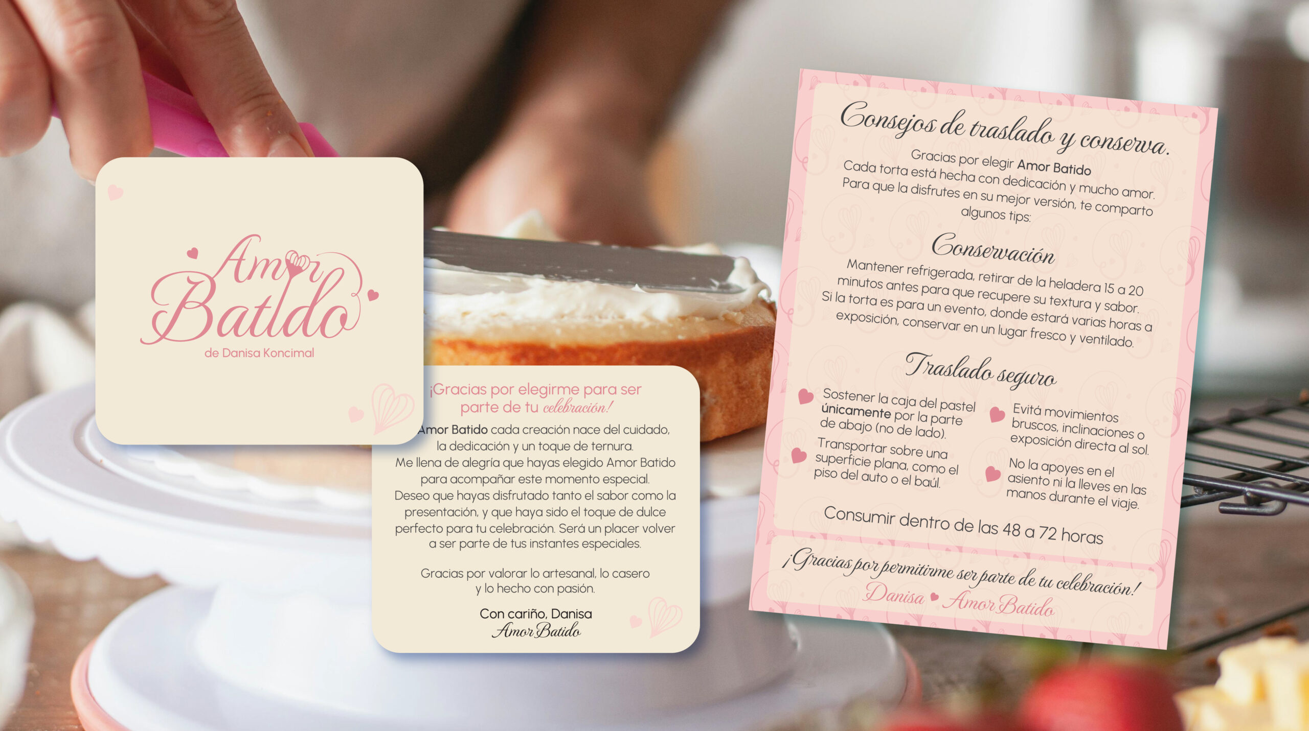 Amor batido nace de la fusión del amor por la pastelería. Se trabajó desde el concepto de la delicadez, lo tierno. No había identidad previa, por lo que se trabajó en estilo de comunicación, logo y versiones, paleta, tipografía, piezas de papelería.